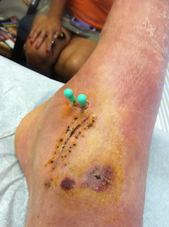 Going in for these bandage changes wasn't bad on the outside looking in. I had no idea the security I felt in having the splint on my foot. It was almost like a security blanket and when they took it off I felt so vulnerable. I thought my foot looked horrible, while the people that see this stuff on a regular basis thought that it looked very good? As you can see to the laypersons eyes it looked nasty.