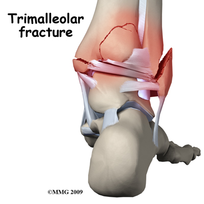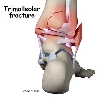I ended up with what they call a 'Trimalleolar Ankle Fracture'. Yes I was sort of like what is that. Well I came to find out that its a combination of three broken (tri) bones in my ankle. I already knew what had happened was no good. I mean when your foot (or any other part of your body for that matter) is simply dangling from your leg, you know its pretty bad. You can search the type of break and get a multitude of views and opinions if you like, but this image that I found sort of shows it in its best viewable way: