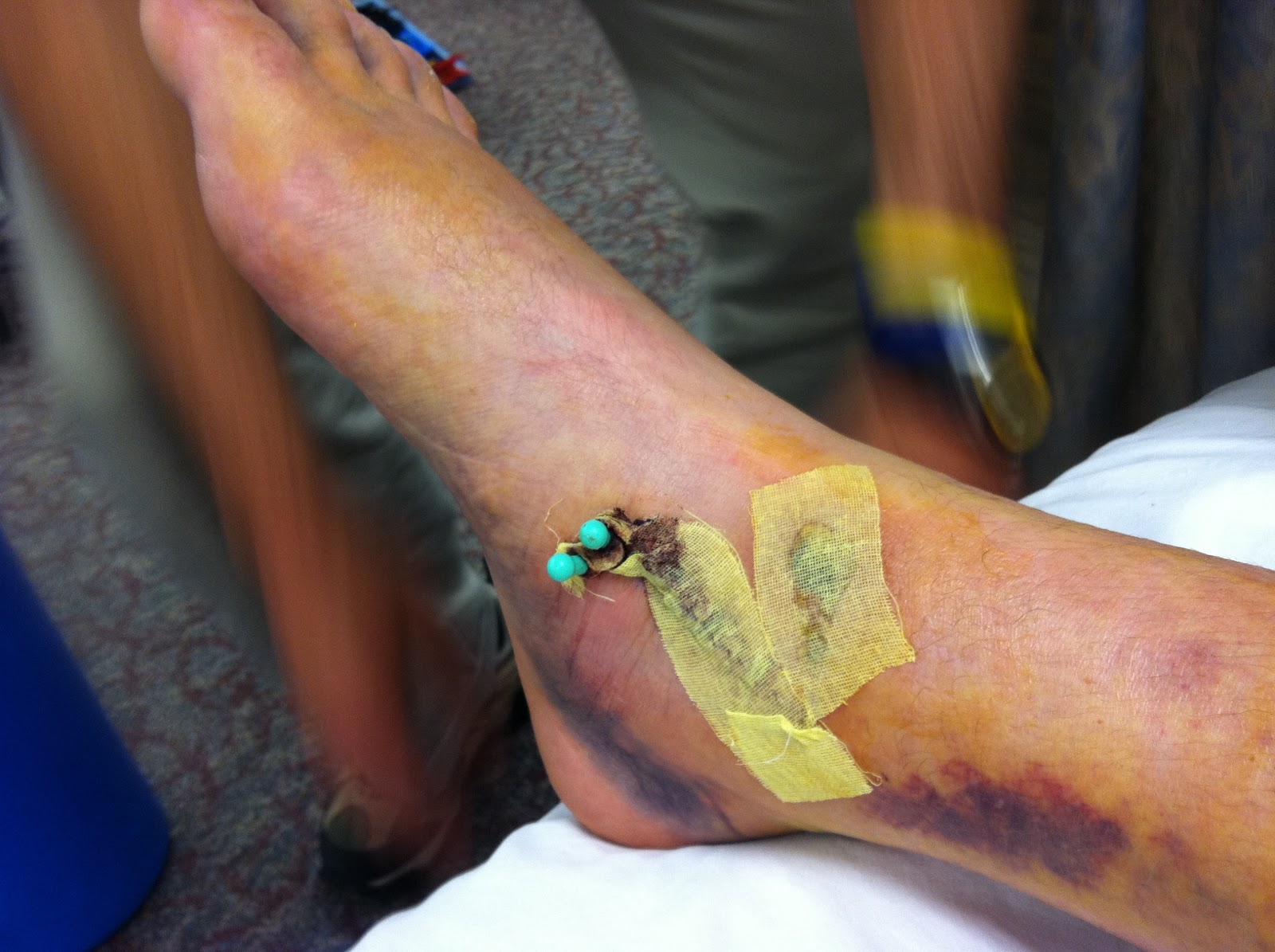 I had a couple days off of work and spent two weeks without my daughter, because of the mobility issues. They also had me come in every two or three days to have the bandages changed on my foot. I ended up with some necrotic tissue where they state that the bones almost penetrated my skin. So this had to be watched carefully so that it did not get infected and cause gang-green. Of course everyone can assume the final result after an infection of that nature. Here are a couple of pictures from the first two weeks of visits for bandage changes: