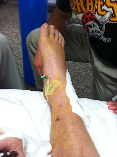 I asked the question, "how bad is this going to hurt me?", and the response I got was "I wont feel a thing!" At least he was able to get me to laugh. It did hurt, and quite possibly because of the angle that the pins were exiting through my skin. After they were out and he stopped pressing on the exit wound, the relief was immediate. They wrapped the foot back up and put me back into the splint and immediately I could not believe the amount of relief that I had, amazing.