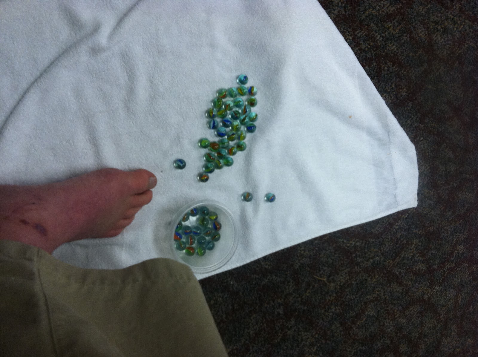 While I had many excersizes that will get my range of motion back, there was one that was interesting to me. My therapist goes and gets a tupperware bowl of marbles and sets them on the bench. After some of the previous rom excersizes he puts them on a towel and has me use my toes to pick them up and put them back into the container. While this seems rather simple a task for someone who hasn't used their foot for anything for seven weeks, it easily tasks the muscles. Here is an image: (I think I will be purchasing some marbles soon)