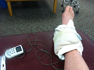 All said after the excercises they apply heat as well as electronic stimulation. Very warm with four electrodes in four locations around my ankle. I know that its supposed to stim the muscles and help speed up the recovery process but sort of not exactly sure why. I think its for 15 minutes and then thats all she wrote for the first session. I imagine depending on the measurements for the range of motion come this monday, that will determine what the next steps are in the process.